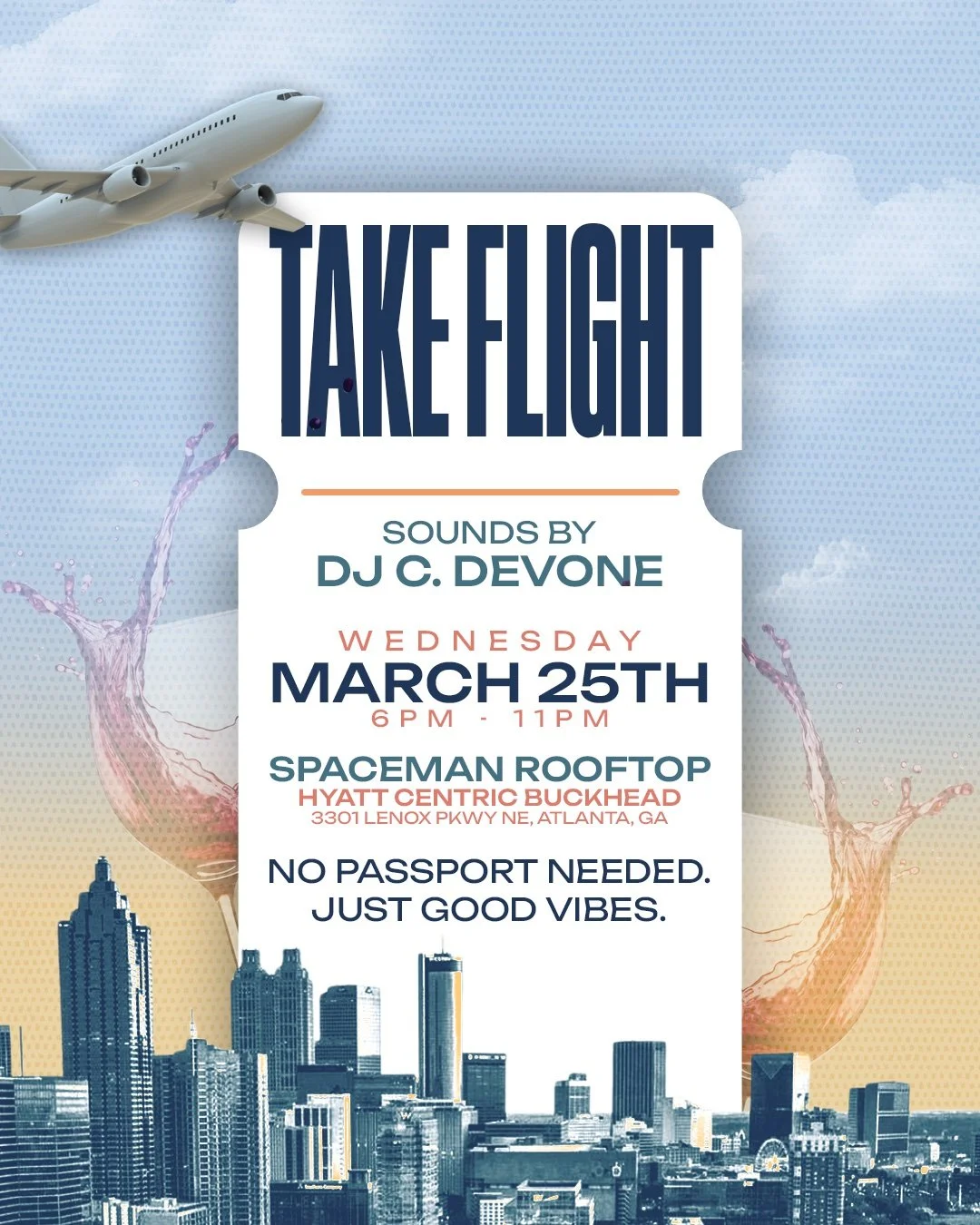 On March 25, the city skyline becomes your backdrop while we blend Hip-Hop, R&B, and global sounds. Sip curated wine flights, connect with fellow adventurers, and feel the energy of a getaway — without leaving Atlanta.